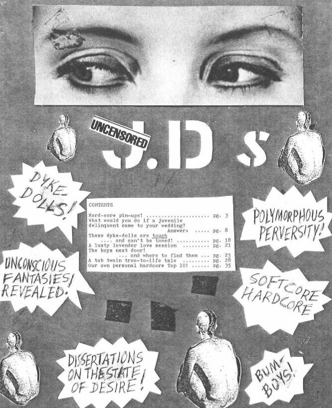 J.D.s was a 'zine created by Bruce LaBruce and GB Jones in Toronto in response to the increasingly unwelcoming punk community.It was used to create a space for queer punks different to mainline punk and the current lesbian/gay community.They coined the term homocore (a play on hardcore) to define the subculture and community.